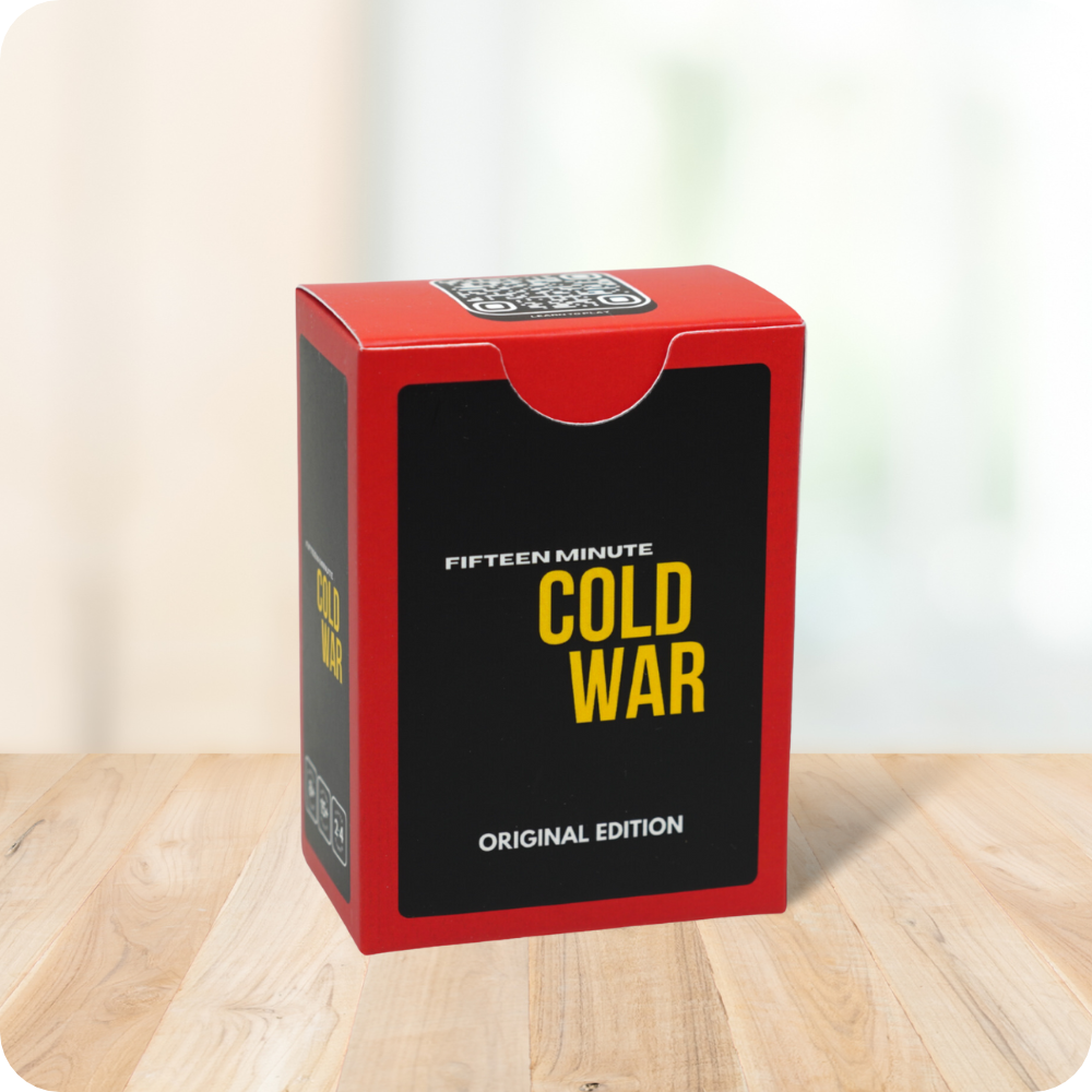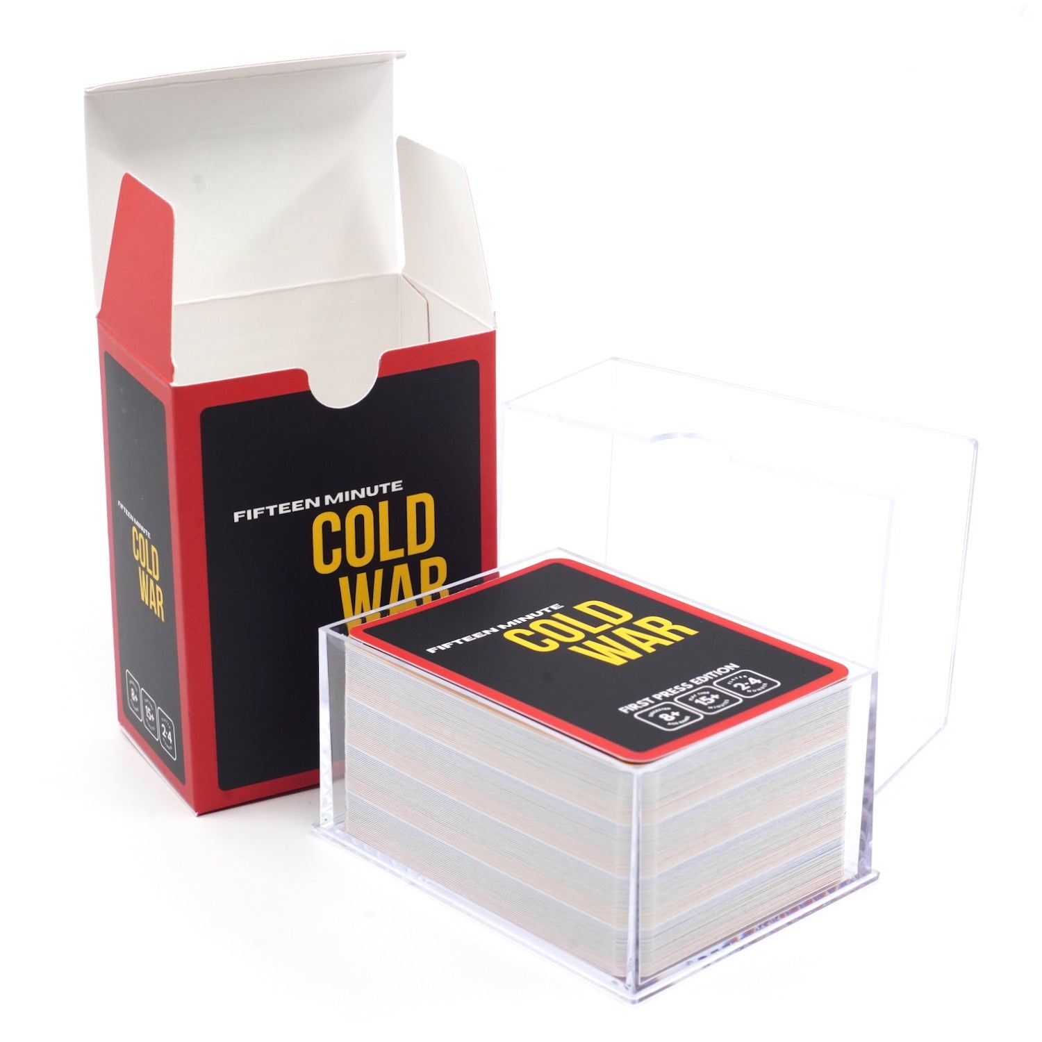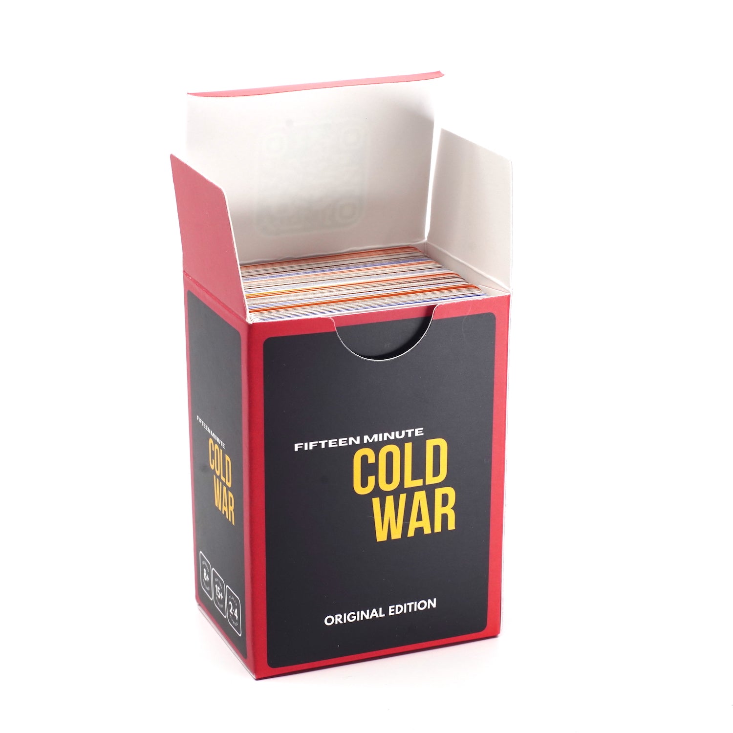 Each 15 Minute Cold War deck contains 100 Premium Quality, matte cello glazed cards that allow up to 4 players to fight it out for the title of Superpower. The game comes in a full-colour flip-top cardboard box.
